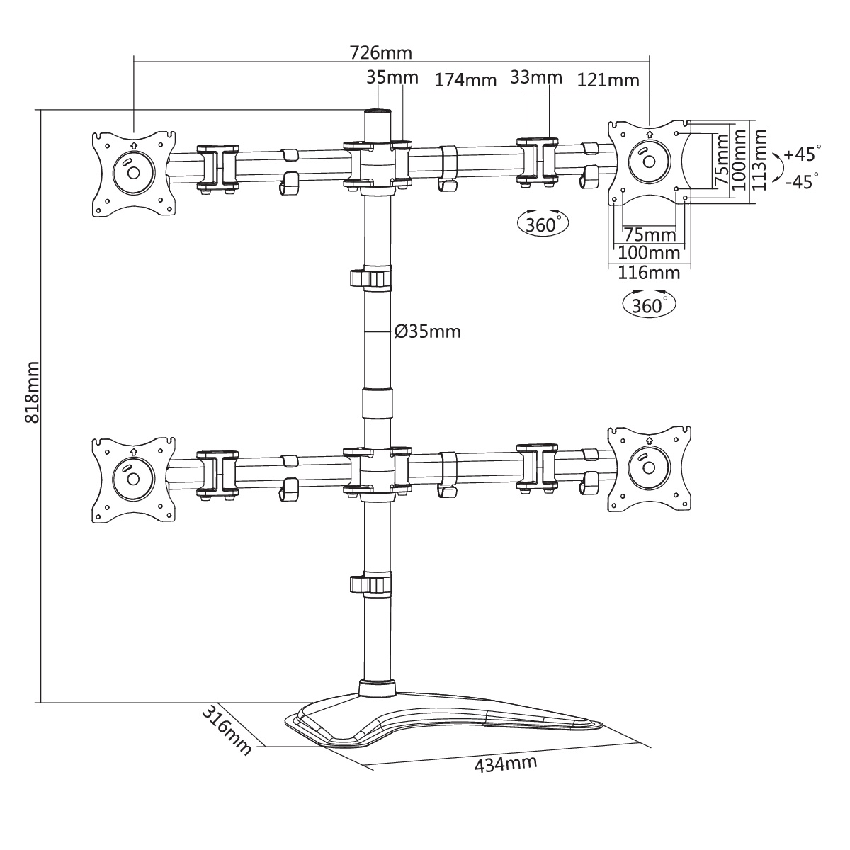 Quadruplets Monitor Mount - Table TopMax. Arm extend 428mmFree StandingStabilizes positions and adjusts the monitor at the position you want